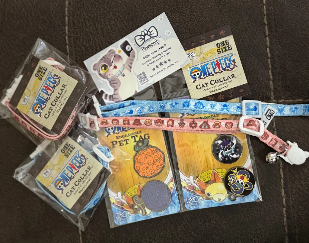 got the one piece new world set (collar, harness, leash) with the gum gum fruit tag for my boy lucio. everything looks great! the light blue color is gorgeous on him. the harness proportions feel a little strange but it could be cause my dog has strange proportions and we aren't used to it yet. my only complaint is that we dont have a full set for luffy or chopper (lucio isnt a zoro guy)
